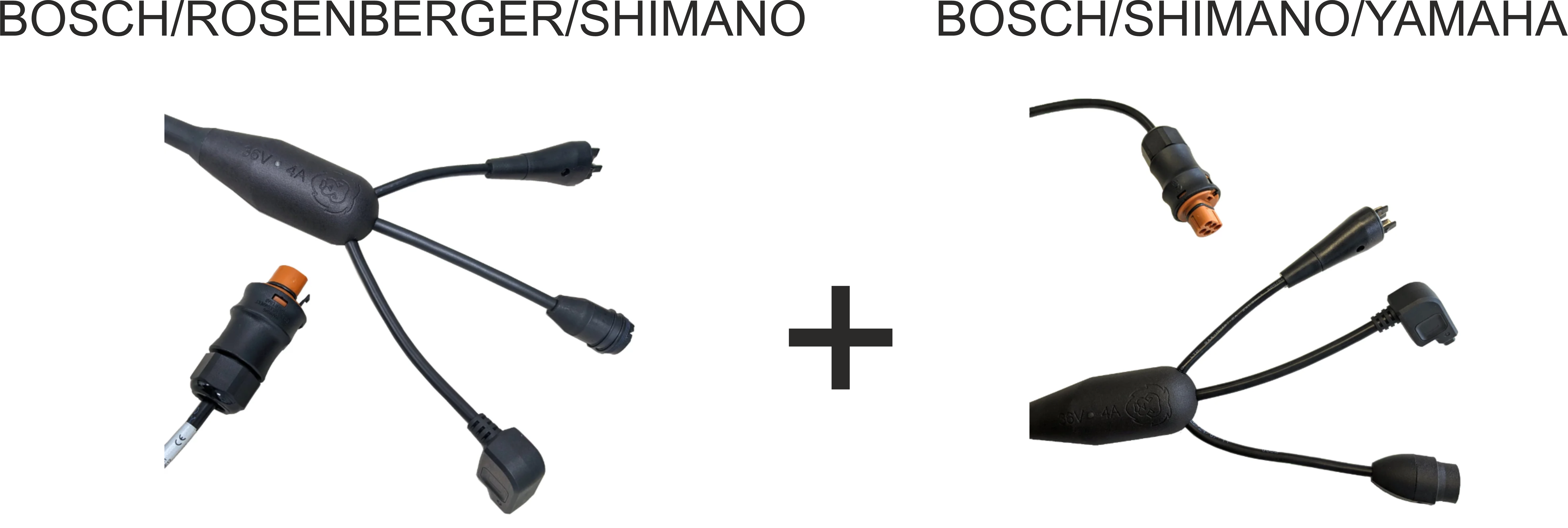 elektrycznym (e-roweru), każdy kabel z trzema różnymi wtyczkami zasilania odpowiadającymi akumulatorowi rowerowemu, wtyczki Bosch/Rosenberger/Shimano/Yamaha.