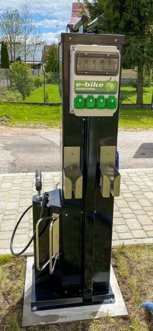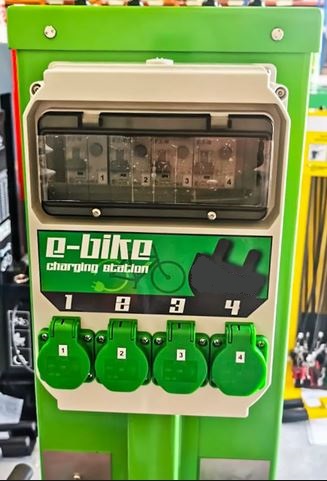 Z tyłu stacji znajduje się moduł z 4 x gniazdami do ładowania rowerów